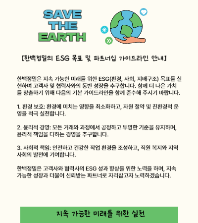 한백정밀은 협력사 여러분과 함께 ESG 경영을 통해 사회적 가치를 창출하고 지속가능한 성장을 이루고자 합니다.